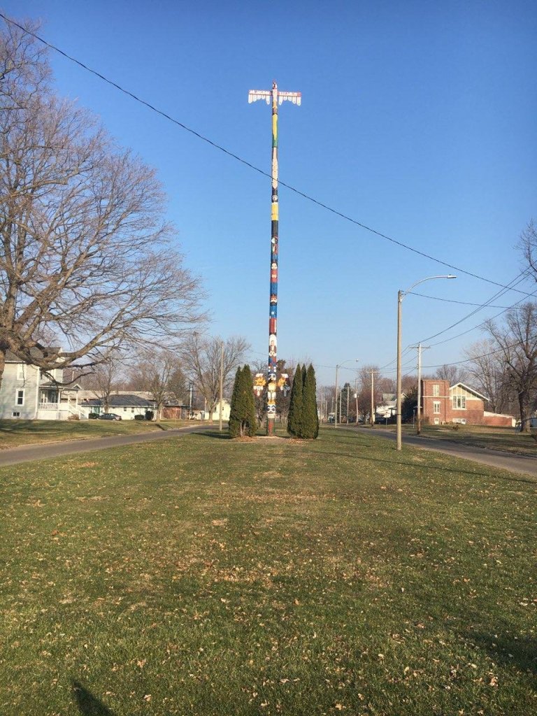 The totem pole is 83 feet tall and actually has a name, Big Daddy. Steve Greenquist carved the pole in 1969. He was a art student at Illinois State University at the time. The project was sponsored by the Abingdon Development Council.