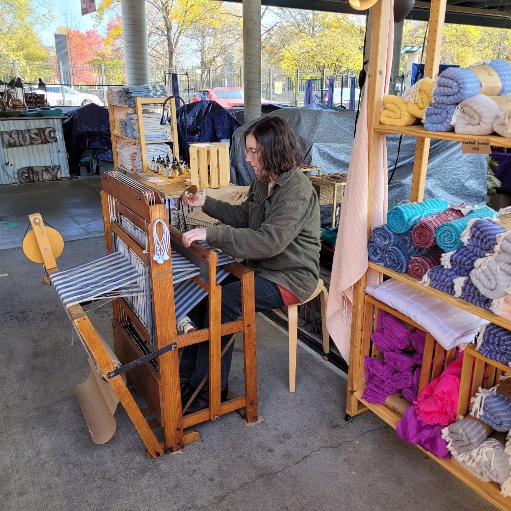 Later in the day ~ Today found us at the Nashville Farmer’s Market. The site has permanent roof shelters and a building. Everything one expects can be found. Of course, food, such as to be eaten there, but produce is available. The typical arts and crafts were available. One young lady was weaving on an old time loom. Watching her brought back fond memories.