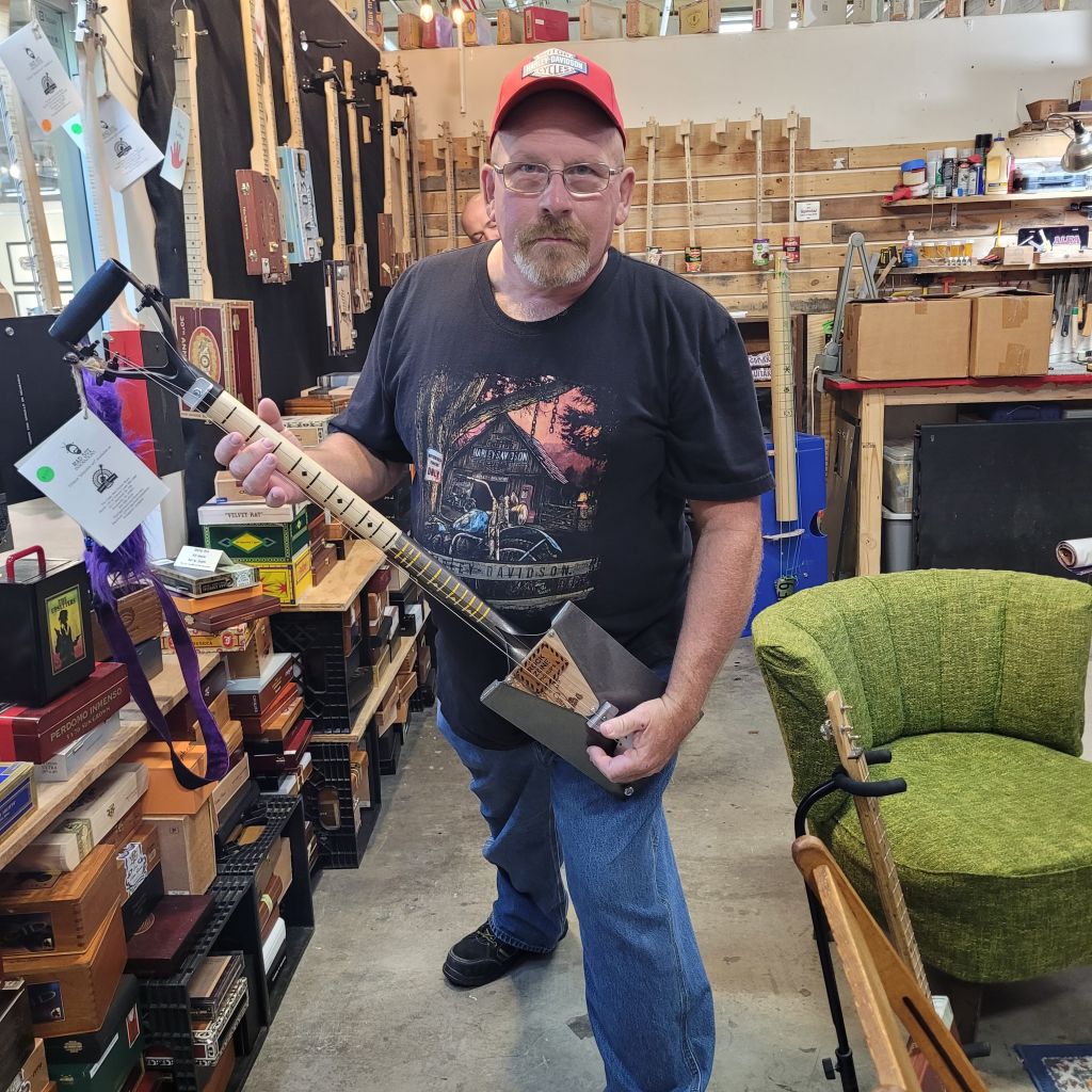 I talked about my returning from Alabama in a previous article. Wanted One Banjo. On Saturday, during our initial meet. Jack, Robert, and company toured Lowe Mills. This is an old textile mill that has been reused as an arts center. Anything from music to painting could be found. One small shop was dedicated to building cigar box guitars.